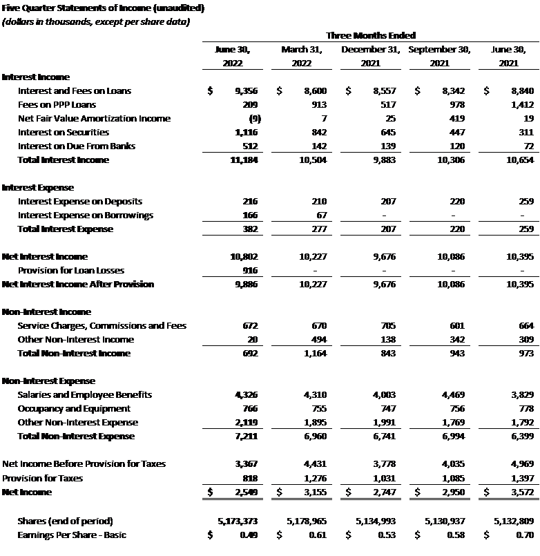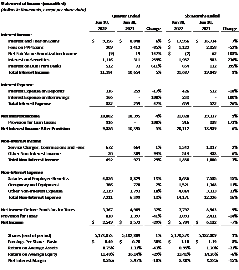 The Bank continues to experience substantial deposit growth with a 19% or $203.7 million increase in total deposits over the last year since June 30, 2021. Non-interest-bearing demand deposits increased 14% or $58.6 million over the last year. Deposit inflows from our clients have been the driving factor in the total assets of the Company increasing 19% or $212.9 million since June 30, 2021 to a total of $1.4 billion at June 30, 2022. The Company’s overall cost of funds has increased slightly to 0.12% as of June 30, 2022, primarily attributable to interest on the subordinated notes issued in February 2022.